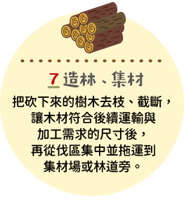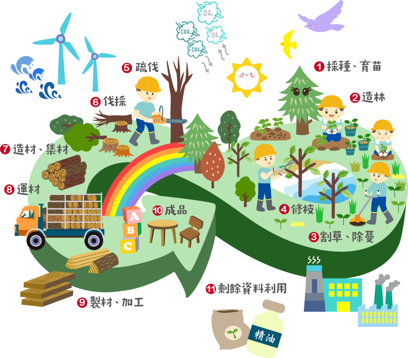在森林永續經營的概念下,大自然中的樹木與森林就像一座巨大的綠色工廠。植物在進行光合作用時,能將二氧化碳轉為碳水化合物與氧氣,並將養分儲存在樹木體內。即使樹木被砍伐製成木材這些碳仍然被封存其中,而木製品也將會是持續儲碳的永續材料。我們透過圖文,讓您了解到森林到成品的完整循環,並深入了解木育教育與永續理念。