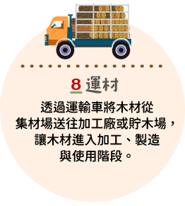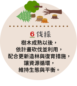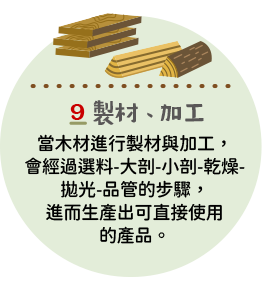 在森林永續經營的概念下,大自然中的樹木與森林就像一座巨大的綠色工廠。植物在進行光合作用時,能將二氧化碳轉為碳水化合物與氧氣,並將養分儲存在樹木體內。即使樹木被砍伐製成木材這些碳仍然被封存其中,而木製品也將會是持續儲碳的永續材料。我們透過圖文,讓您了解到森林到成品的完整循環,並深入了解木育教育與永續理念。